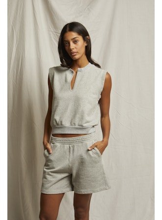 The Sloane French terry split top from perfectwhitetee combines premium quality with a timeless design, offering a versatile style that seamlessly transitions from casual to refined looks.