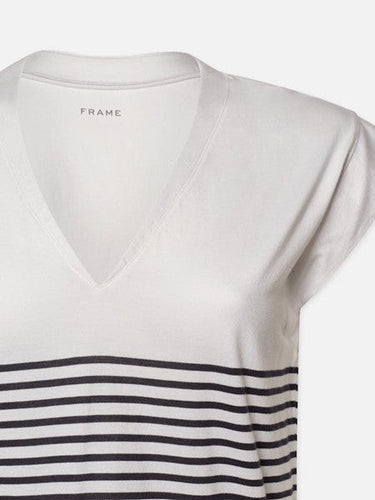 Add a fresh twist to your wardrobe with Frame’s striped V-neck top. Its classic stripes and flattering neckline create a timeless look that effortlessly enhances any outfit. Made from soft, high-quality fabric, this top offers all-day comfort while adding a touch of sophistication to your style. Perfect for pairing with jeans or layering under jackets, it’s a versatile essential that brings both elegance and ease to your everyday wear.