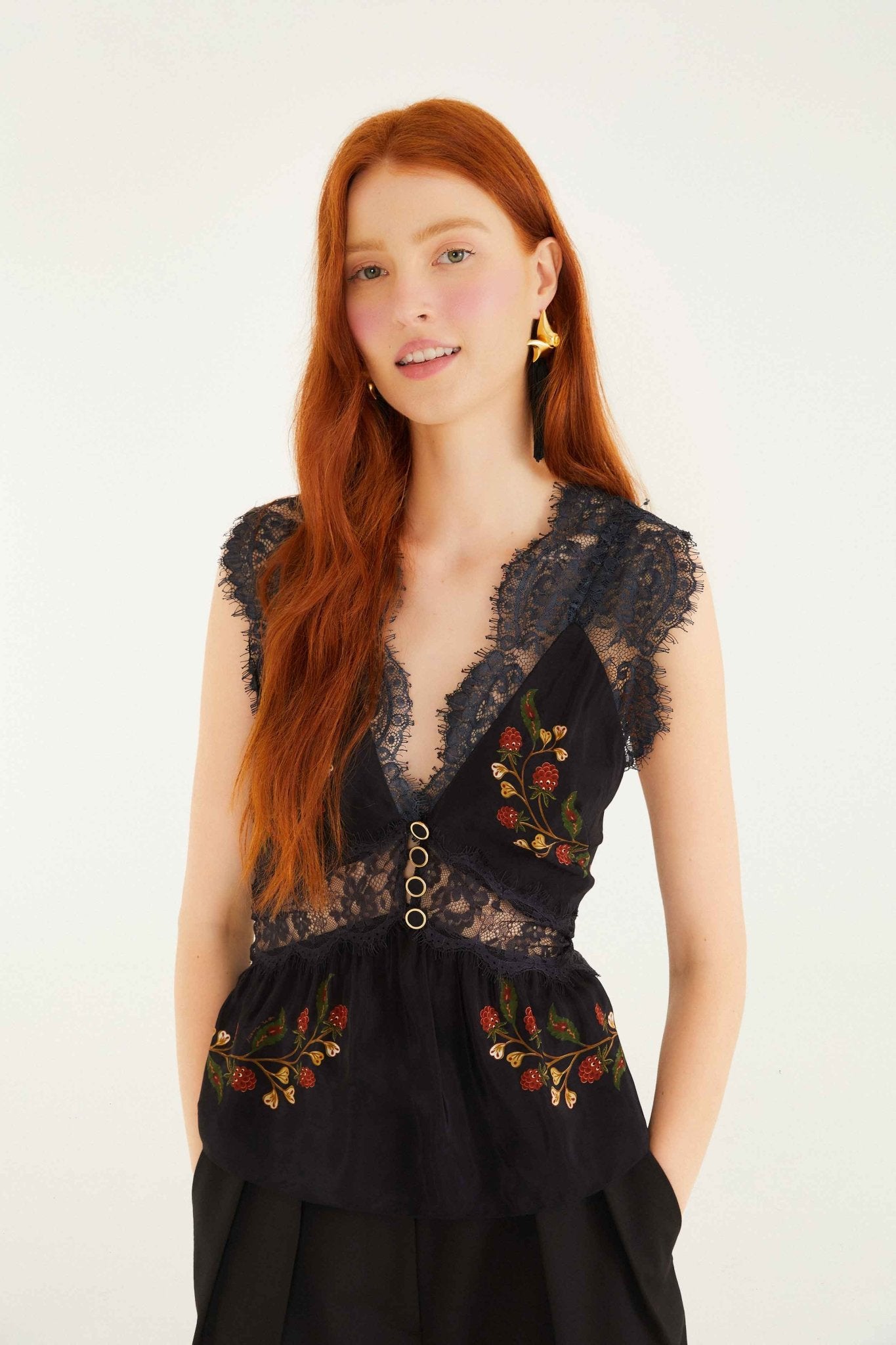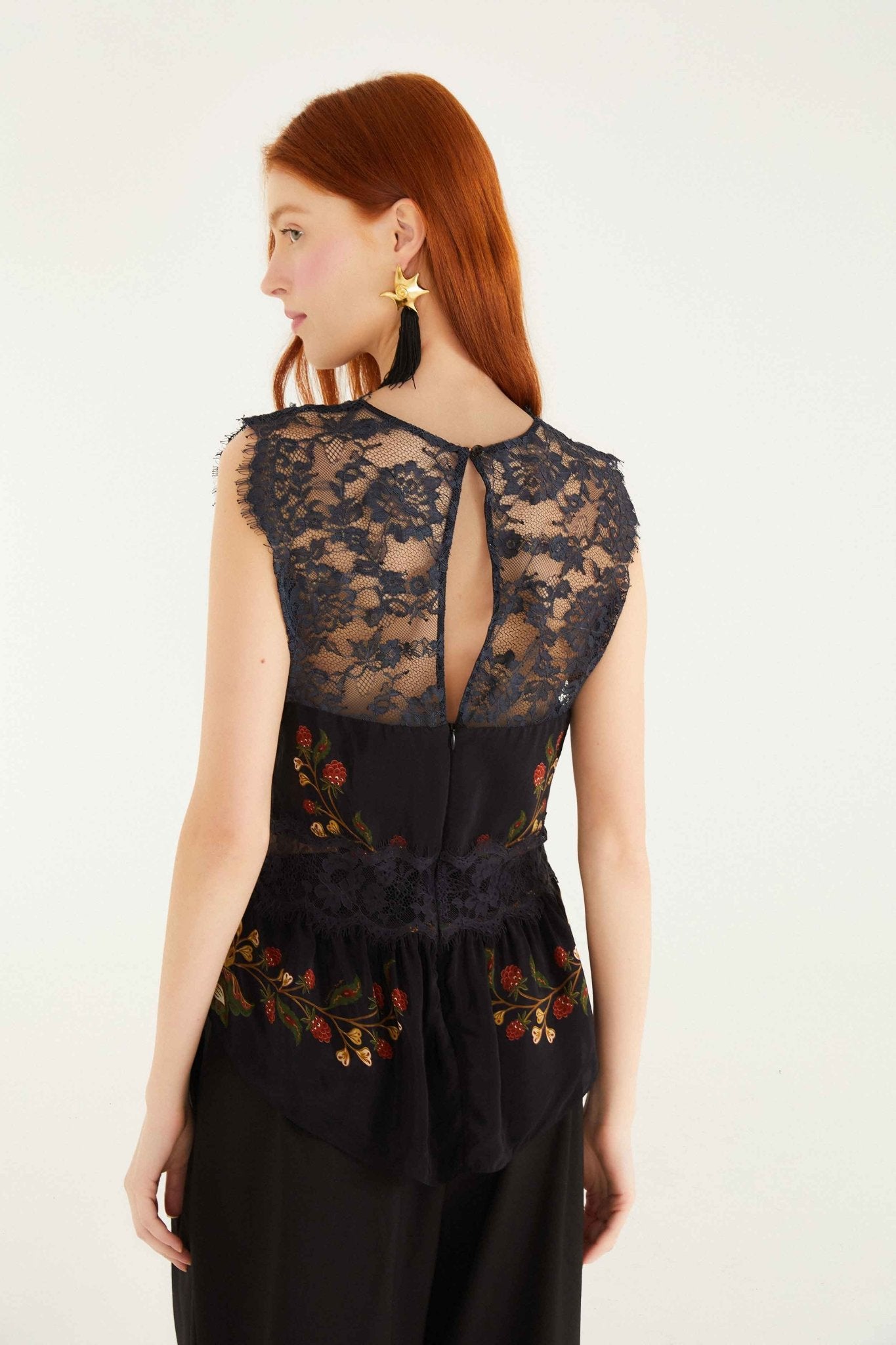 Add a touch of delicate sophistication with the Berry Garden Black Sleeveless Lace Blouse. Its intricate lace design offers a feminine and elegant look, perfect for layering or wearing on its own. The sleeveless cut keeps it light and comfortable, ideal for warm days or chic evening outings. Elevate your wardrobe with a blouse that blends classic beauty and modern style effortlessly.